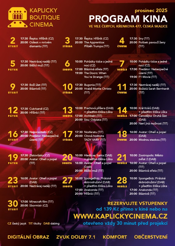 V prosinci 2025 se ve vile Čerych v České Skalici koná pestrý program filmových projekcí. Můžete se těšit na širokou nabídku filmů, včetně českých pohádek a zahraničních trháků. Program zahrnuje projekce jako 'Pohádky tisíce jedné noci', 'Bláznivá střela', 'Predátor' a mnoho dalších. Přijďte si užít filmy s digitálním obrazem a zvukem Dolby 7.1.